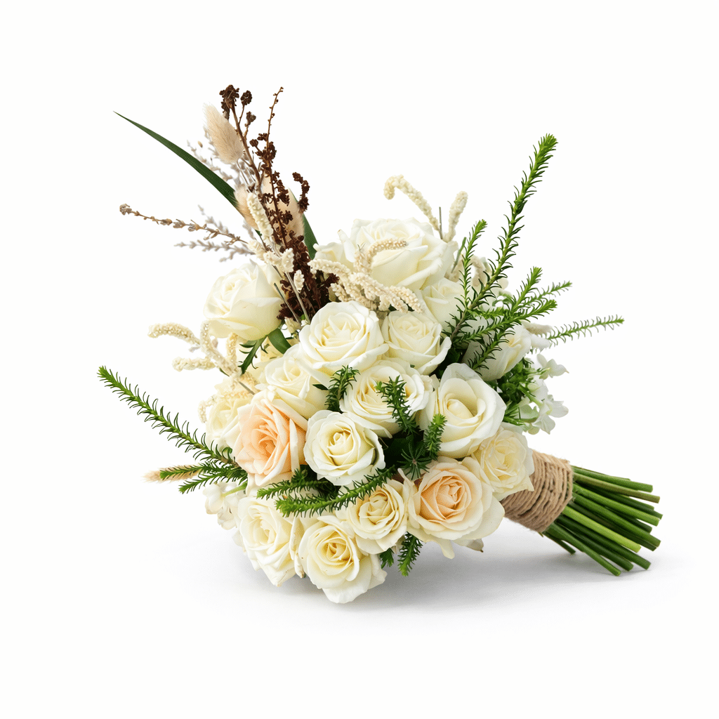 הקומפוזיציה בנויה בגבהים משתנים בכוונה, ליצירת מראה טבעי ולא סימטרי מדי – עשיר אך מאוזן. גווני הקרם והניוד יוצרים תחושת יוקרה שקטה, מושלמת לכלה שמחפשת אלגנטיות רכה עם נוכחות מרשימה.