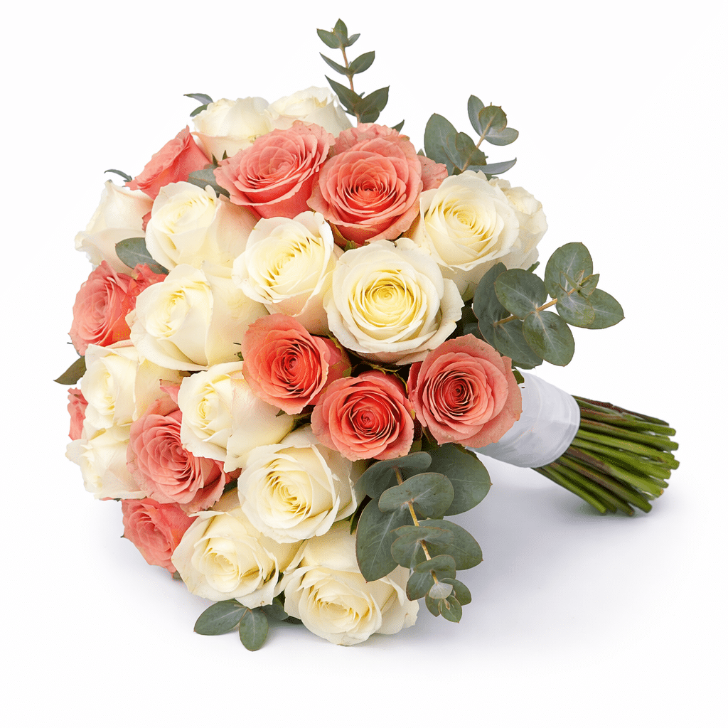 זר כלה רומנטי ועשיר המשלב ורדים בגווני שמנת, פודרה וקורל עדין, בנגיעות ירק אקליפטוס טבעי.