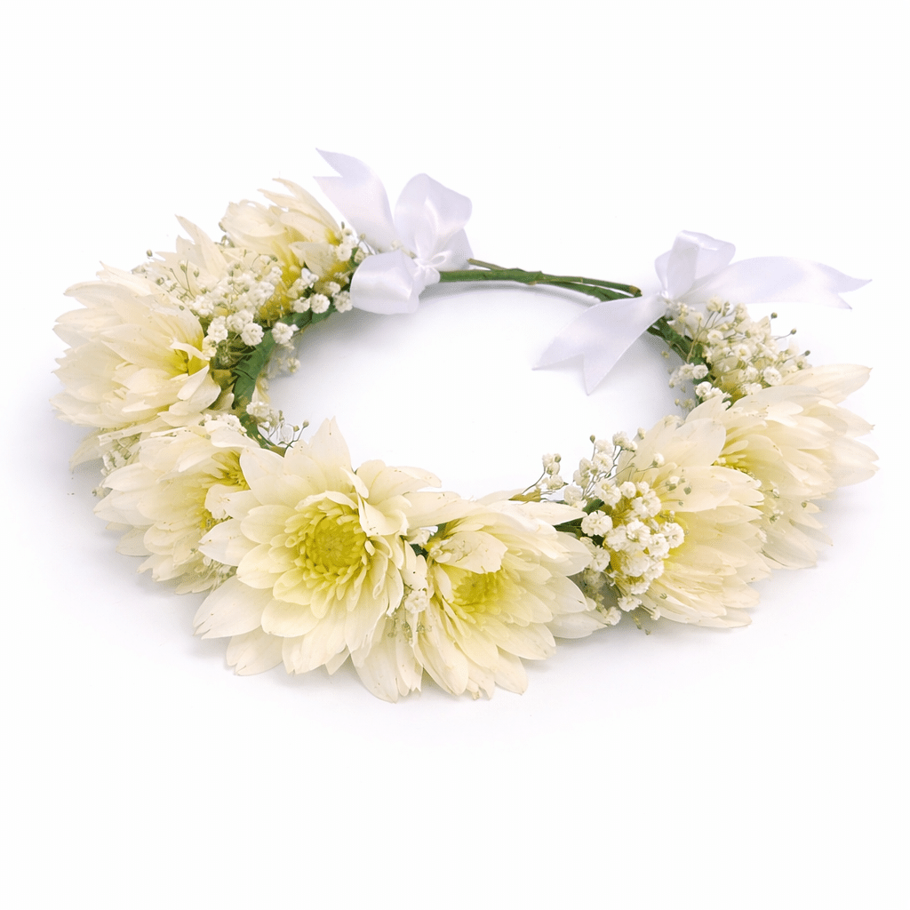 זר לראש עשיר מפרחי חרציות בגוון שמנת רך עם מרכז ירקרק עדין, בשילוב גיפסנית לבנה להשלמת נפח טבעי ומאוזן.