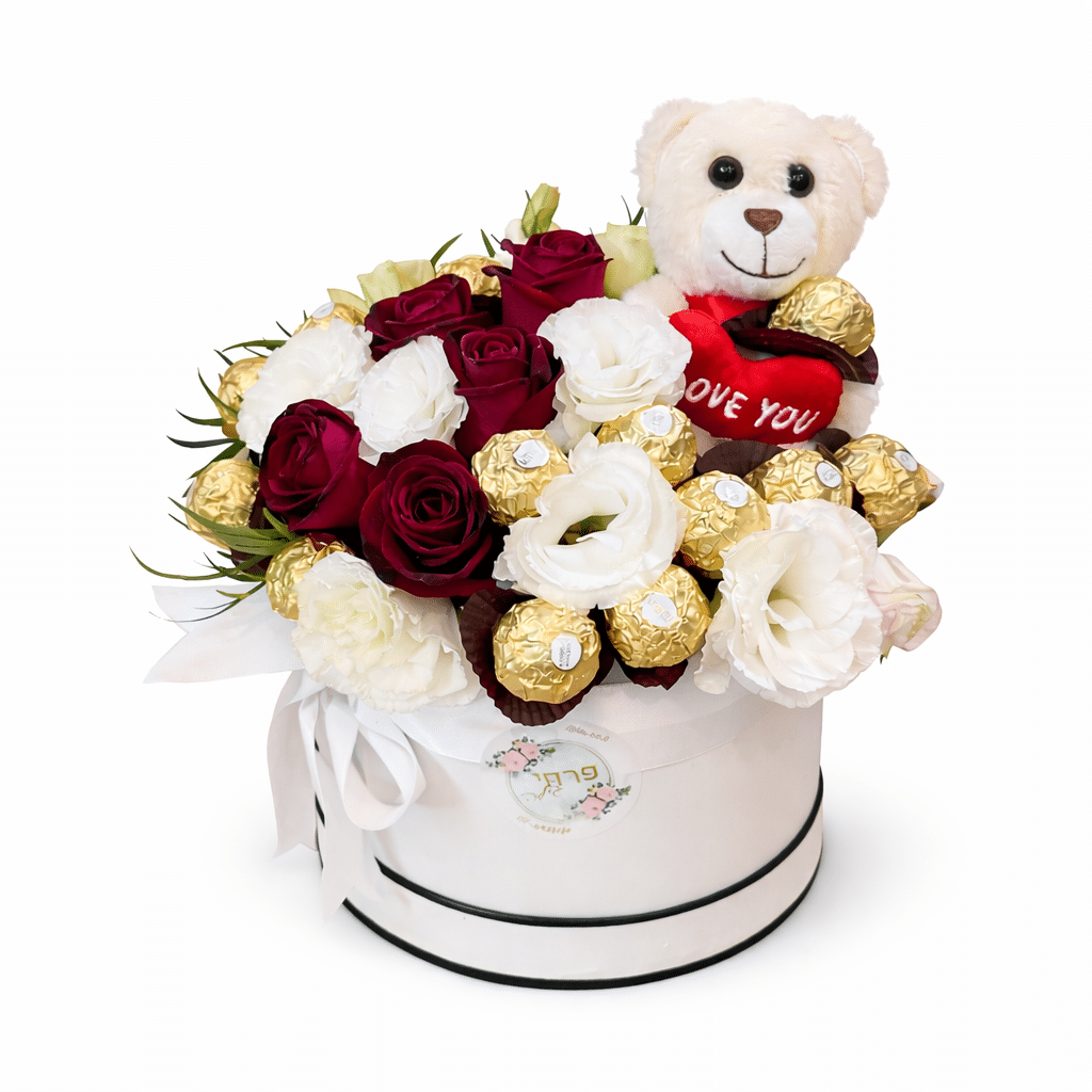 סידור פרחים רומנטי ומפנק בגוונים של אדום עמוק ולבן קרמי. שילוב קלאסי של ורדים אדומים, פרחי ליזיאנטוס לבנים ושוקולדי פררו רושה מוזהבים, לצד דובי רך עם לב אדום. הסידור מעוצב בקופסה אלגנטית עם סרט לבן, ומשדר חום, אהבה ופינוק מתוק במיוחד.