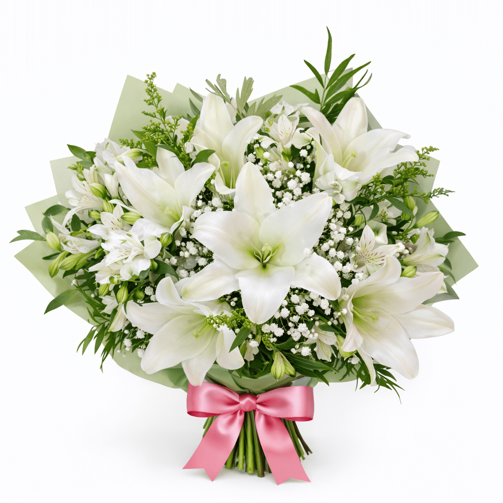 זר שושן צחור מרהיב, בשילוב אלסטרומריה עדינה, גיבסניות רכות וירק עשיר שמעניק עומק ותנועה טבעית לכל הסידור.