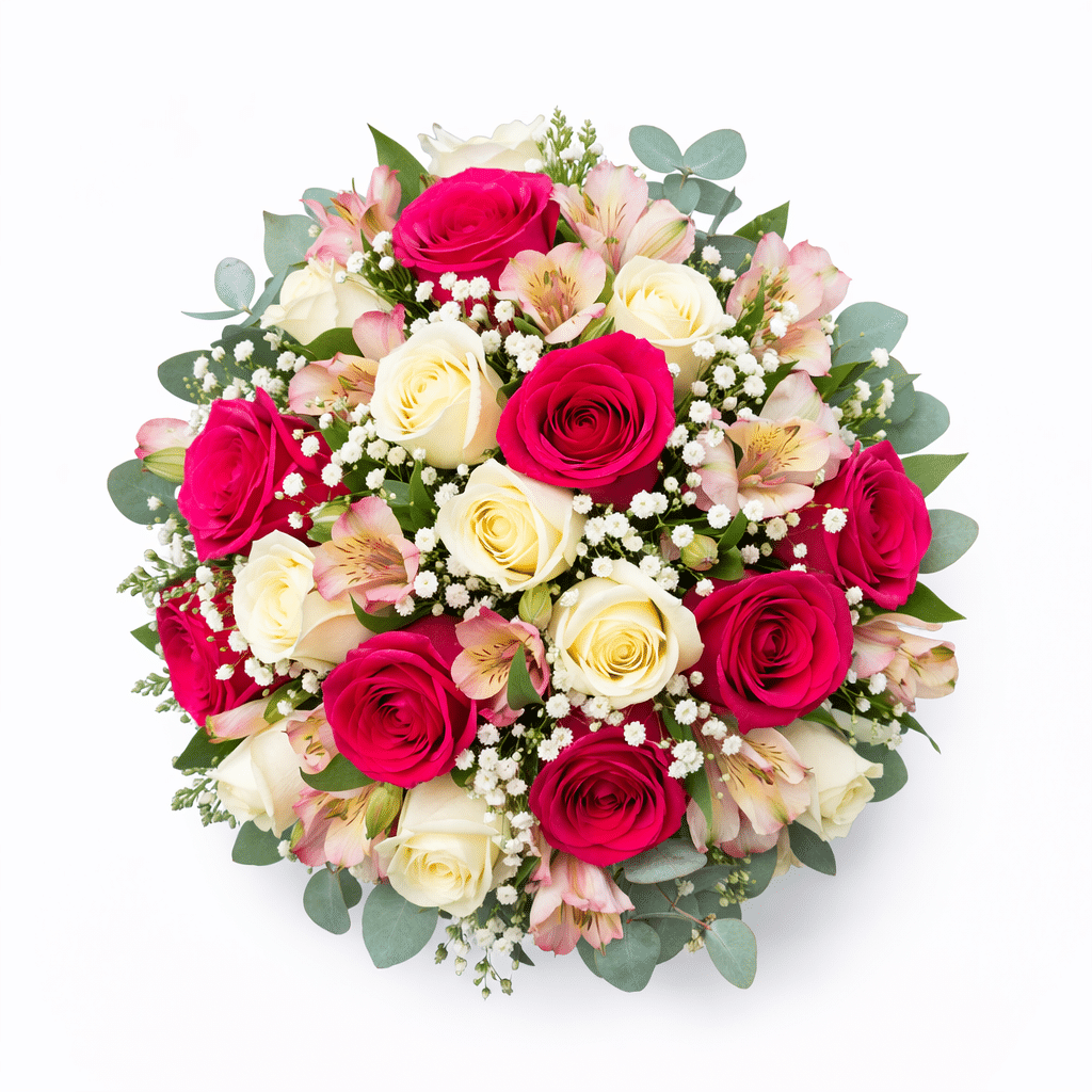 זר כלה אמבר הוא שילוב מרהיב של ורדים בגוון פוקסיה עמוק לצד ורדים שמנת רכים, בשילוב אלסטרומריה עדינה, גיבסניות ואקליפטוס טבעי שמעניק מסגרת ירקרקה אלגנטית.