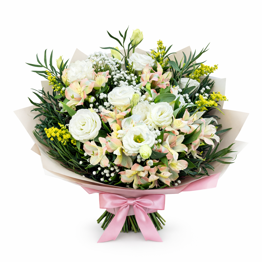 זר נקי ויוקרתי בגווני לבן ושמנת, בשילוב ליזיאנטוס, אלסטרומריה ופרחים עדינים.