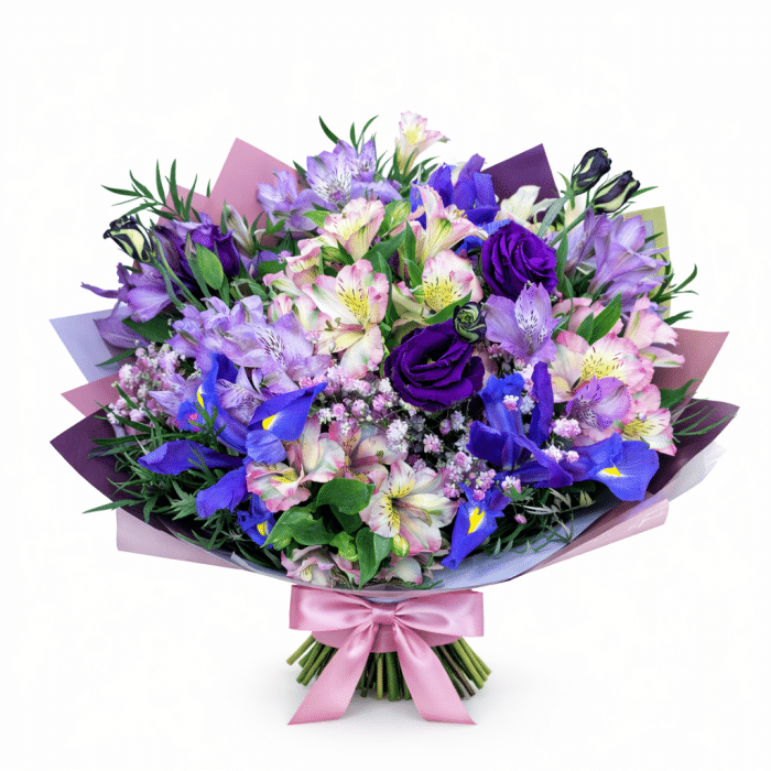 זר פרחים עשיר ומרשים בגווני סגול, לילך וורוד, עם ליזיאנטוס, אירוסים, אלסטרומריה ופרחי מילוי עדינים.