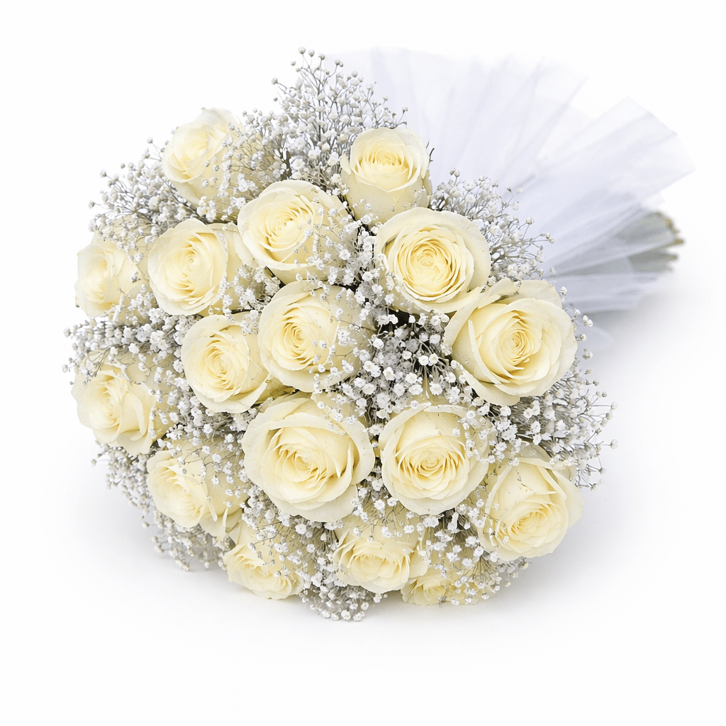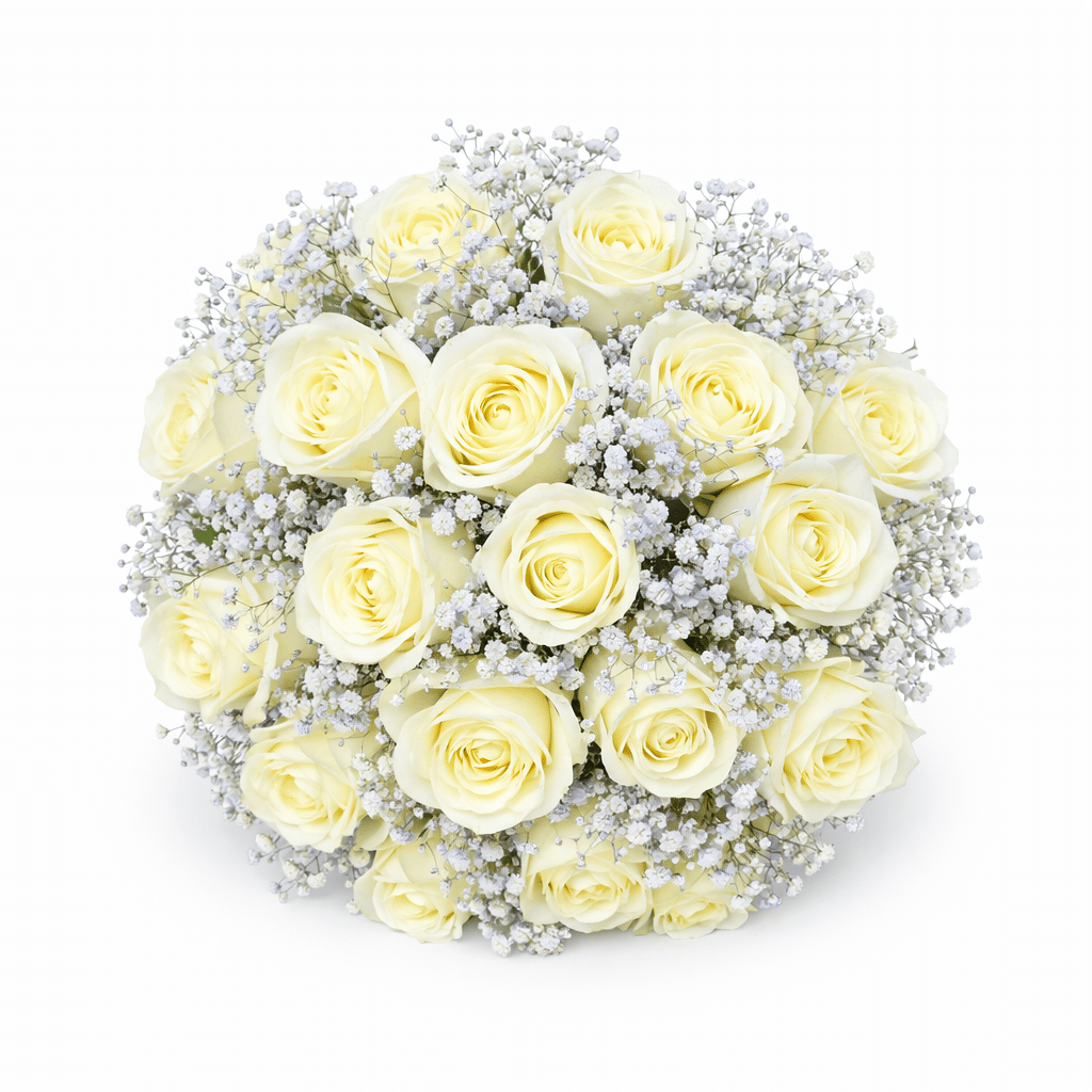 זר כלה איידה הוא זר מלא נוכחות, קלאסי ונקי, שמקרין אלגנטיות נסיכותית וטוהר מושלם. ורדים לבנים גדולים ושופעים משתלבים בענני גיפסנית עדינה, ויוצרים מראה עשיר אך רך, כזה שמרגיש חגיגי, יוקרתי ועל־זמני בו־זמנית.