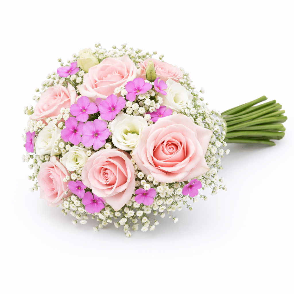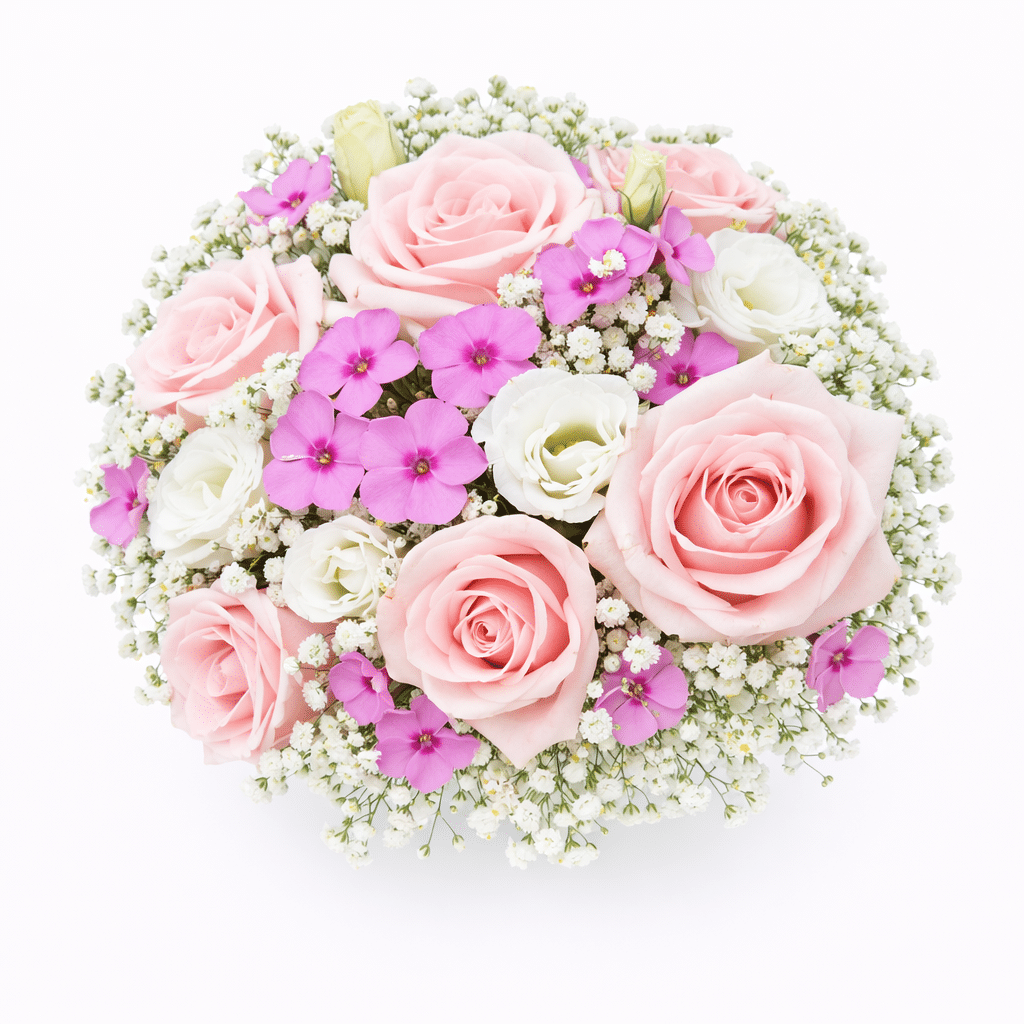 זר כלה גבריאלה הוא זר רומנטי ועדין המשלב ורדים בגוון ורוד פודרה רך יחד עם פרחי ליזיאנטוס לבנים, פלוקס ורוד וגיבסנית עדינה המעניקה לזר מראה אוורירי וטבעי. שילוב הגוונים בין ורוד עדין ללבן יוצר זר אלגנטי, רך ומלא חיים, עם נגיעות פריחה קטנות שמוסיפות עומק וטקסטורה מיוחדת.