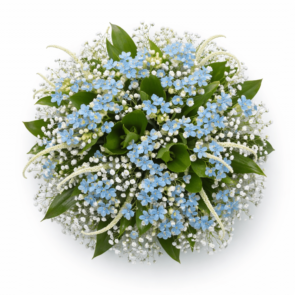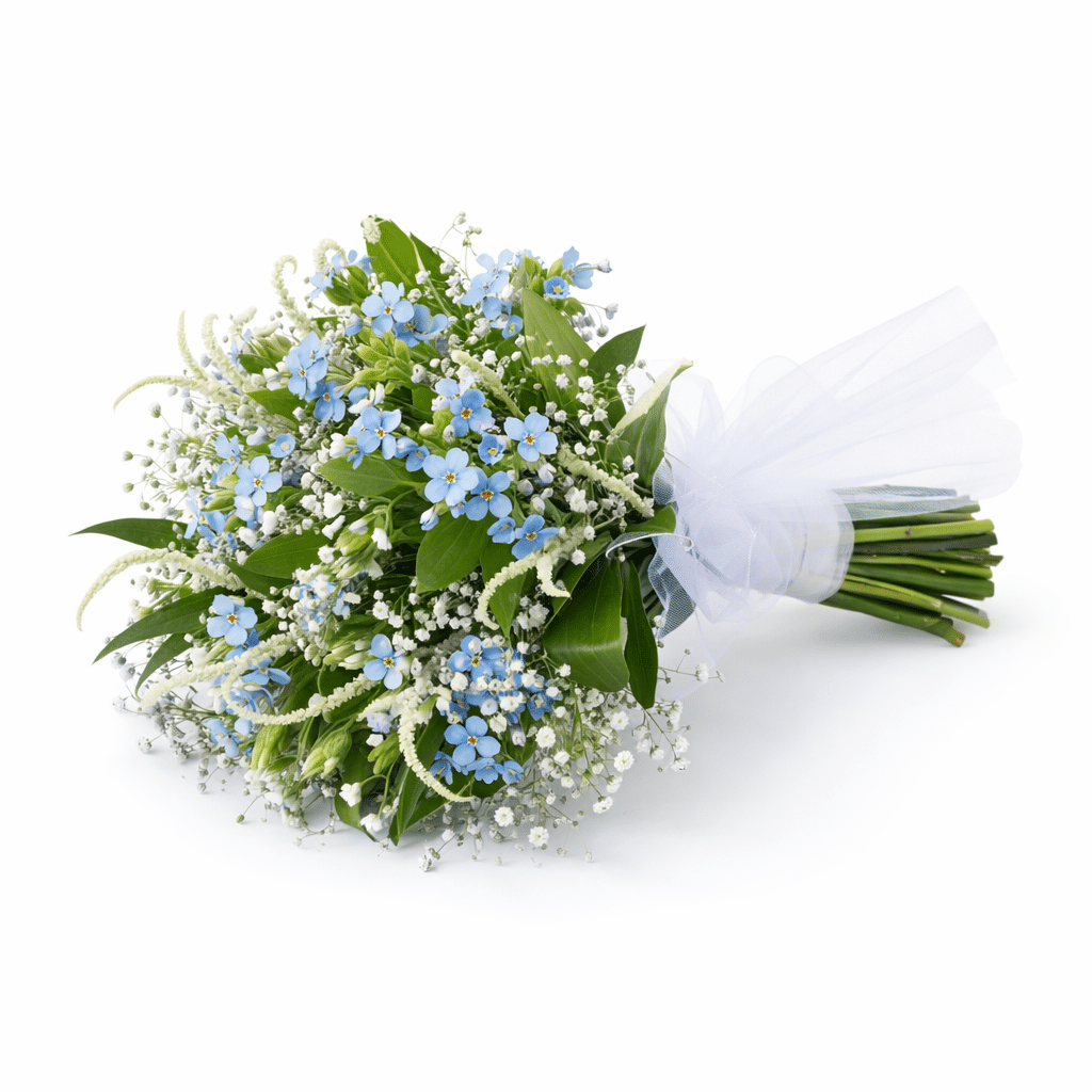 זר כלה אוורירי ומלא תנועה, בעיצוב טבעי ורומנטי שנראה כאילו נאסף בשדה פריחה קסום. שילוב עדין של פרחי תכלת רכים, גיבסנית לבנה וטקסטורות שדה קלילות יוצר מראה טהור, רענן וייחודי.