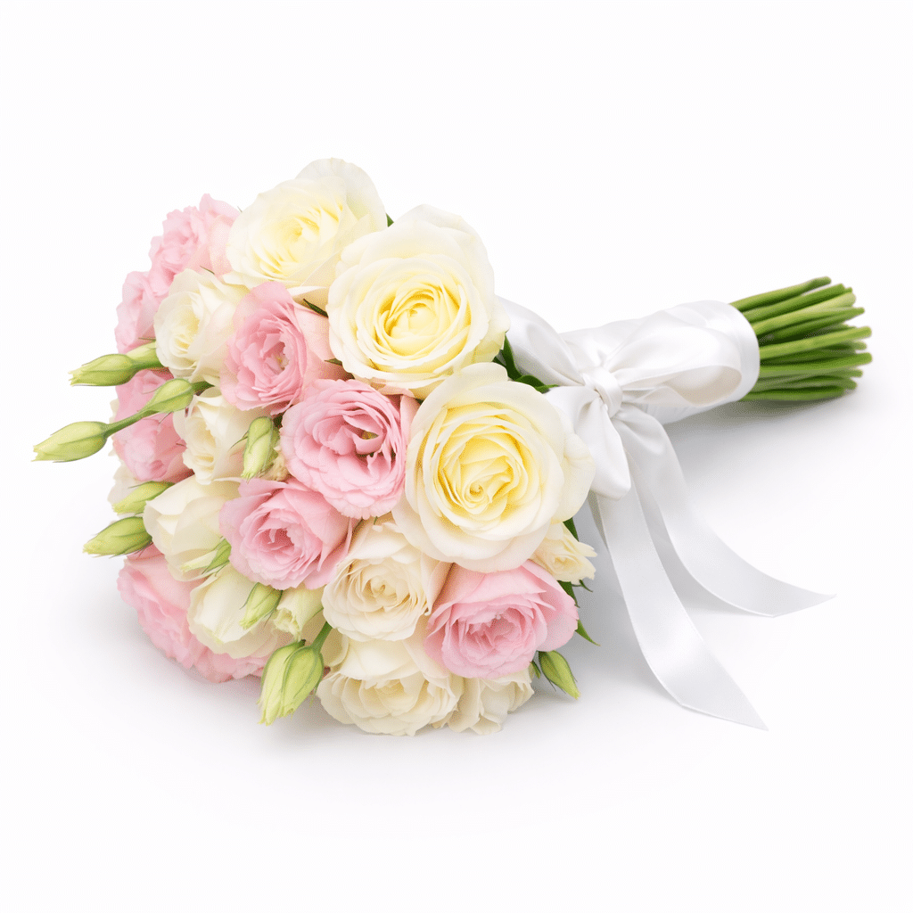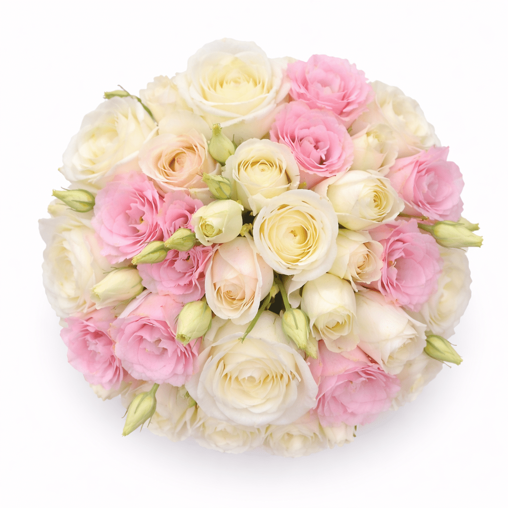 זר כלה רומנטי ועדין בגוונים רכים של שמנת, ורוד פודרה ונגיעות אפרסק בהיר. הזר משלב ורדים קלאסיים לצד פרחי ליזיאנטוס עדינים וניצנים ירקרקים המוסיפים עומק טבעי ותנועה רכה לסידור כולו. שילוב הפרחים יוצר מראה מלא, אלגנטי והרמוני עם תחושה רכה ונשית במיוחד.