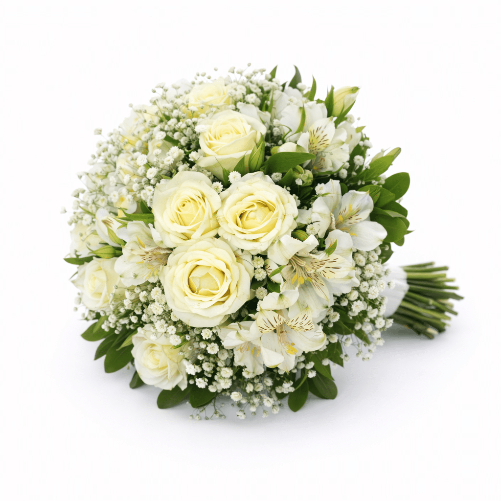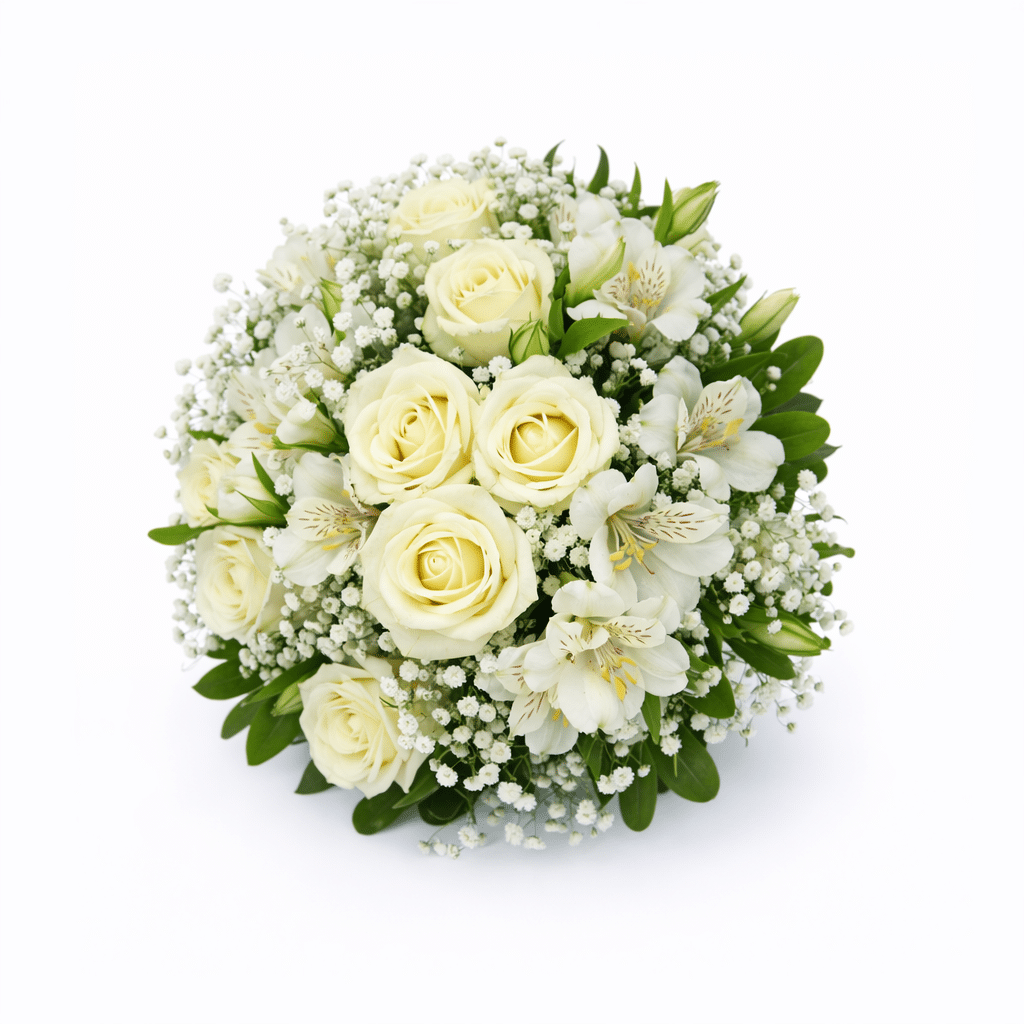 זר כלה מיכל הוא זר קלאסי, רך ועל־זמני, המשלב ורדים בגווני שמנת עדינים עם אלסטרומריה לבנה ונגיעות ירוק טבעי. השילוב יוצר מראה עגול, מאוזן והרמוני, שמשדר אלגנטיות שקטה וטוהר.