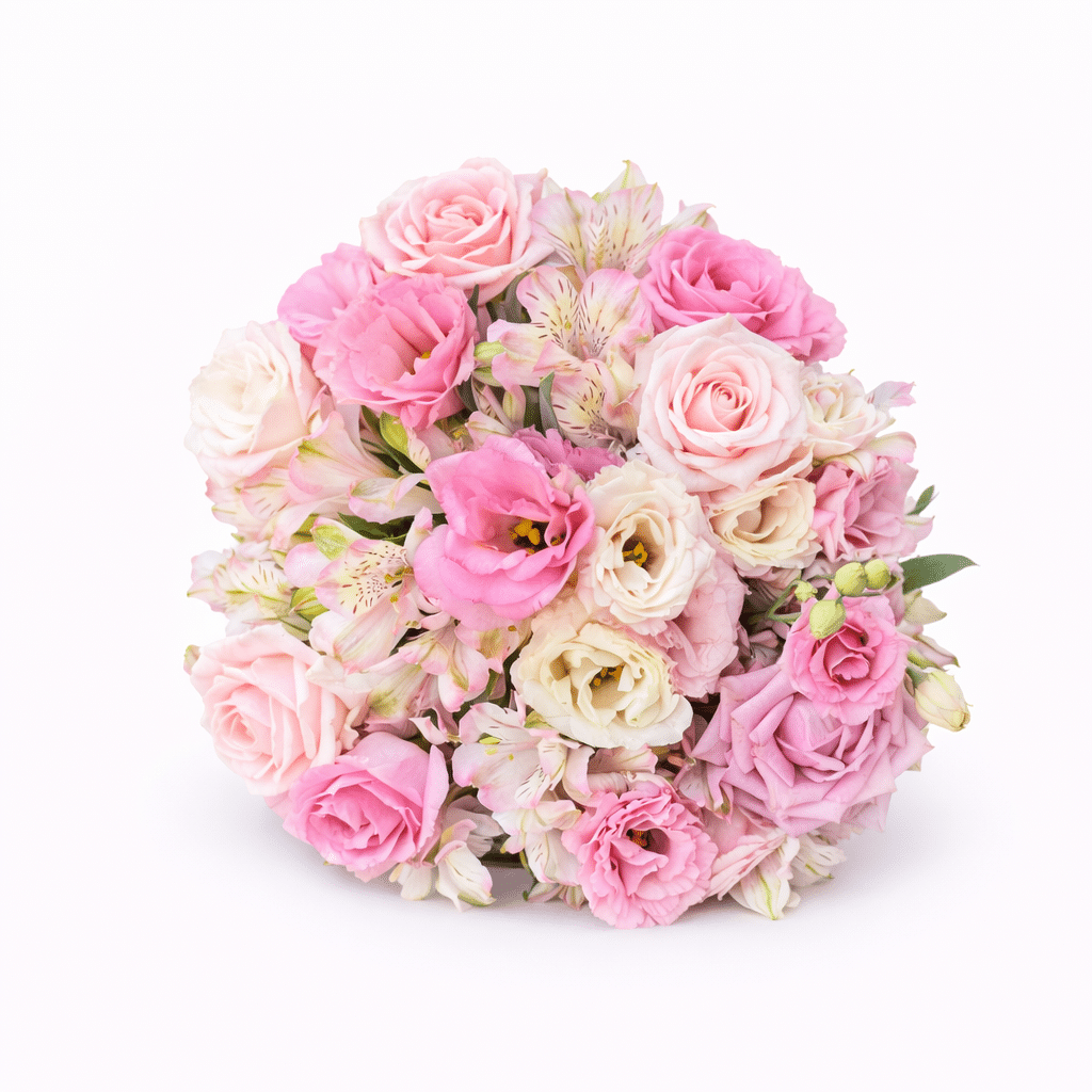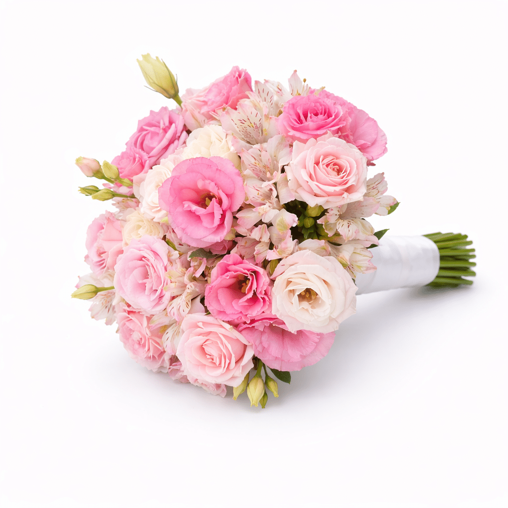 זר כלה רומנטי ועדין בגווני ורוד פודרה, ורוד רך ושמנת. הזר משלב ורדים עדינים, ליזיאנטוס במרקם רך ואלסטרומריה בעלת נגיעות טבעיות עדינות, היוצרים יחד קומפוזיציה עשירה אך קלילה למראה.