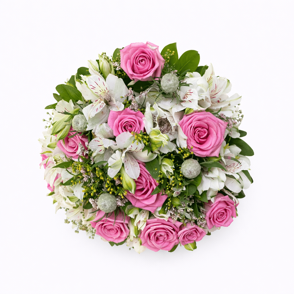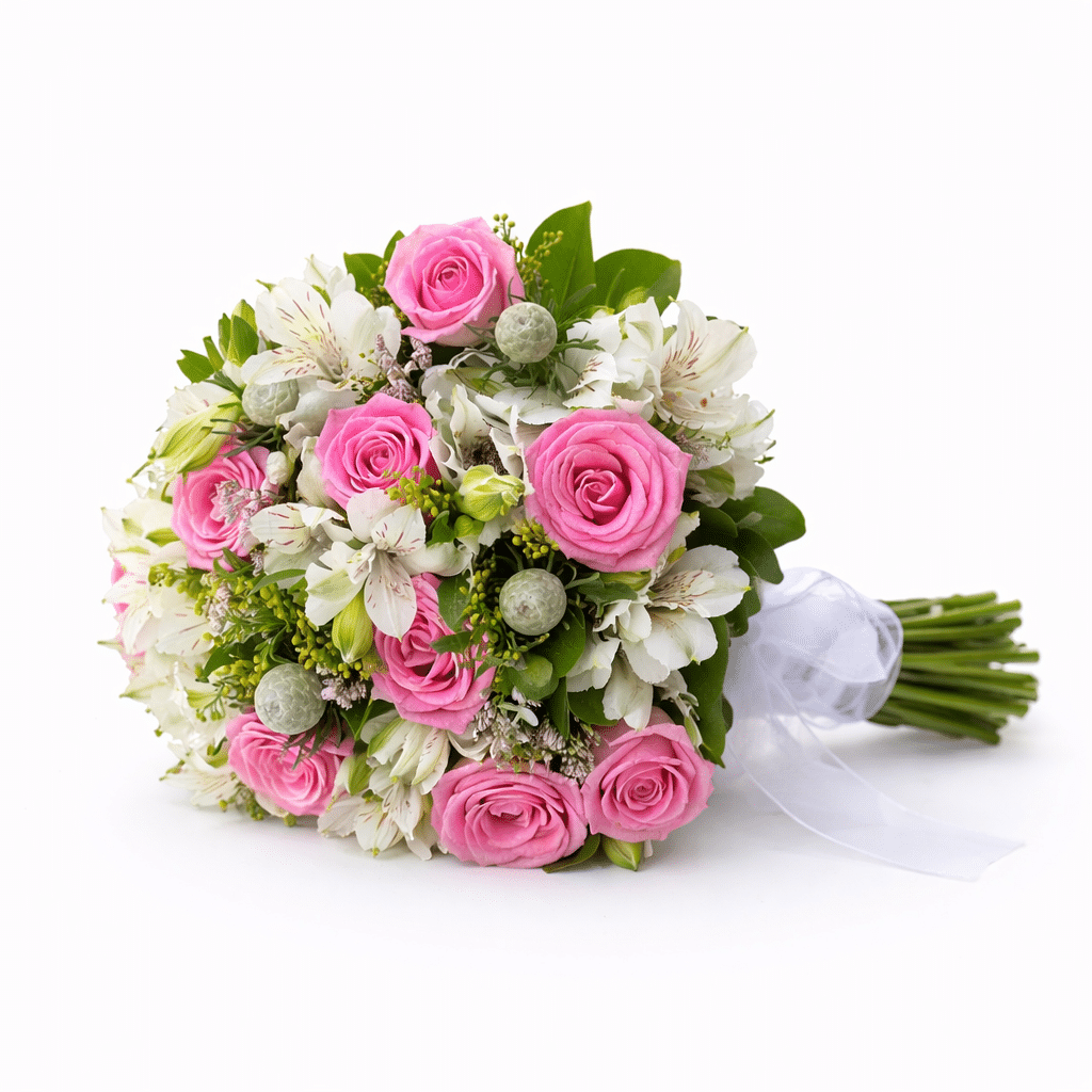 זר כלה שרלין הוא זר רומנטי ועדין המשלב ורדים ורודים רכים עם אלסטרומריה לבנה ונגיעות ירק טבעי. שילוב הצבעים העדין בין ורוד פודרה, לבן וירוק יוצר מראה קלאסי ואלגנטי שמדגיש רכות ונשיות.