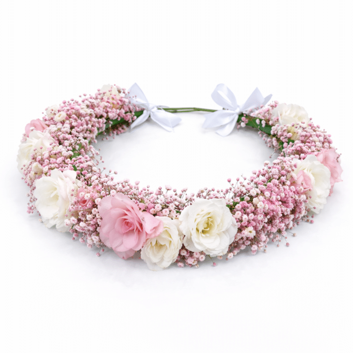 זר לראש רומנטי בעבודת יד, המשלב ליזיאנטוס בגווני ורוד עדין ושמנת עם גיפסנית ורודה צפופה ליצירת מראה מלא אך טבעי.