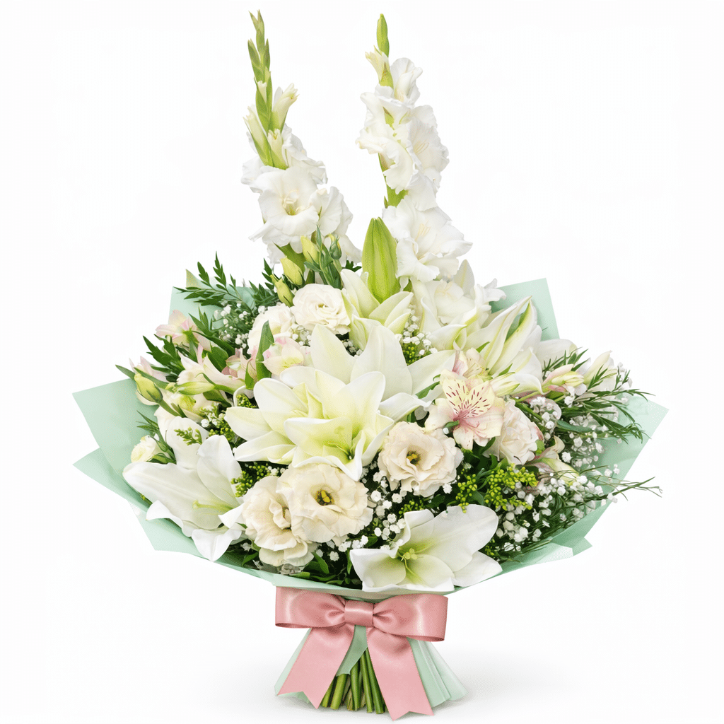 זר פרחים מרשים ואצילי המשלב גלדיולות לבנות גבוהות עם שושן צחור פתוחות במלוא הדרן, ליזיאנטוס רך, אלסטרומריה עדינה ונגיעות גיבסניות וירק עשיר.