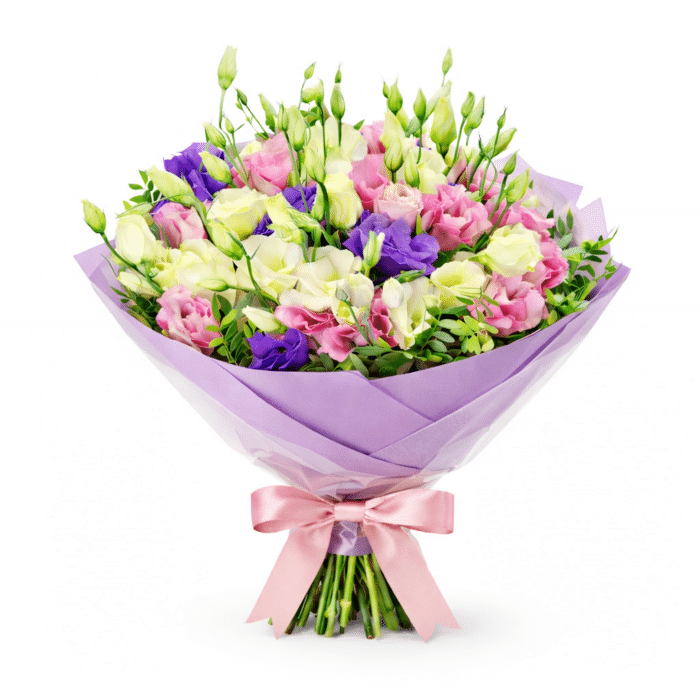 זר פרחים עשיר ומפנק המשלב ליזיאנטוס עדין במגוון גוונים רכים של ורוד, שמנת וסגול, יחד עם ירק טבעי שמדגיש את יופיים של הפרחים ויוצר מראה מלא, רענן ואלגנטי.