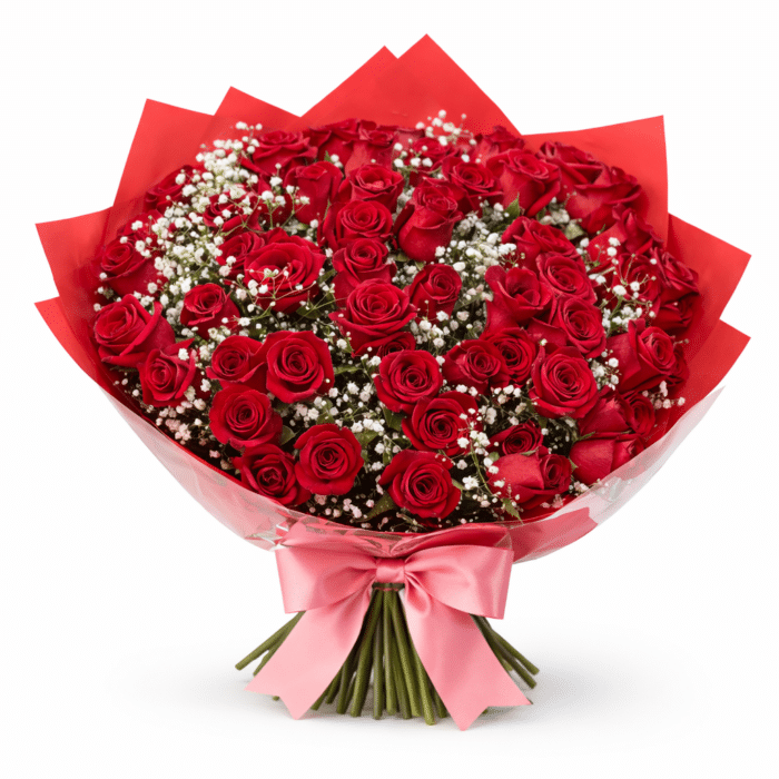 זר עוצמתי ומרשים המורכב מ־51 ורדים אדומים קטיפתיים, בשילוב נגיעות גיבסניות לבנות שמוסיפות רכות ועדינות למראה הכללי. האדום העמוק יוצר נוכחות דרמטית, מלאה תשוקה ועוצמה – עשיר אך לא כבד, קלאסי אך תמיד מרגש.