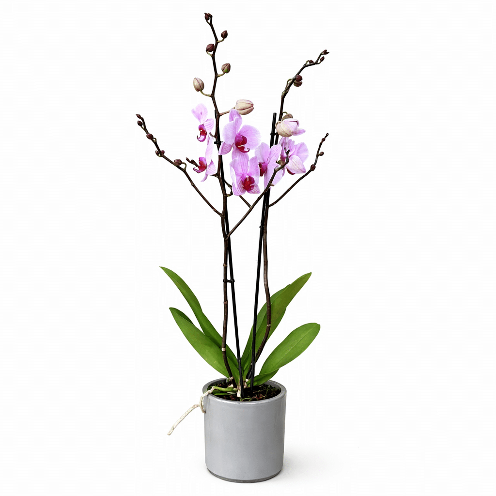מגיע בכלי קרמי בגוון אפור מינימליסטי, המשלים את הפריחה ומדגיש את האלגנטיות של הסחלב.