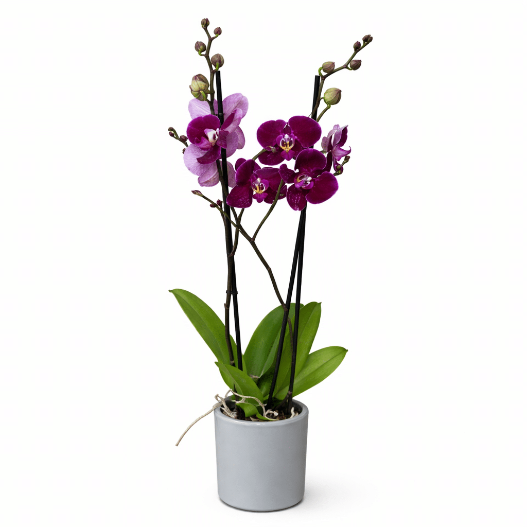 מגיע בכלי קרמי בגוון אפור מינימליסטי, המדגיש את צבעי הפריחה ומעניק מראה הרמוני ומעודן.