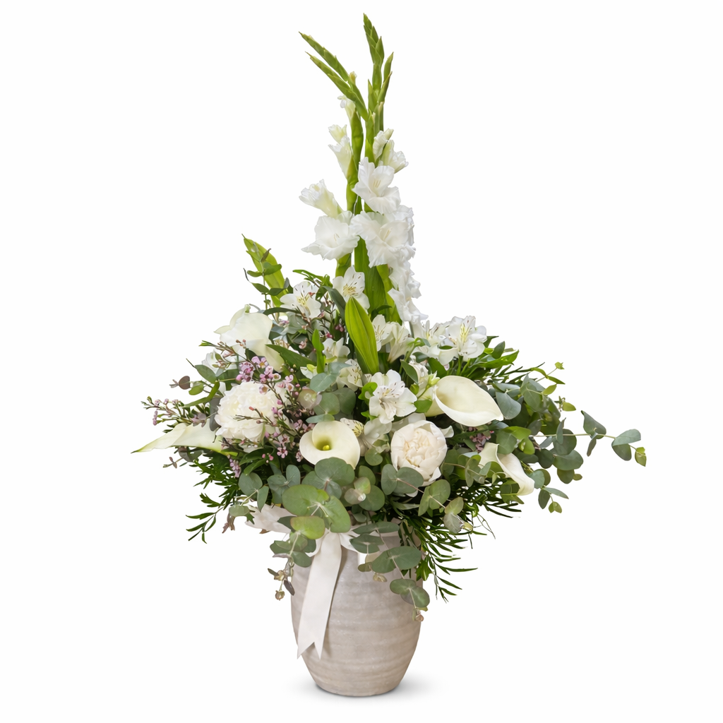 סידור פרחים מרשים בגוונים נקיים של לבן וירוק טבעי. שילוב אלגנטי של גלדיולה לבנה גבוהה, קאלות לבנות, אלסטרומריה לבנה ופרחים עדינים בגוון ורדרד רך, עם ירק עשיר ואקליפטוס נשפך. הסידור מעוצב בקווים גבוהים וזורמים בכלי דקורטיבי בהיר, ומשדר רוגע, ניקיון ויוקרה שקטה בכל חלל.