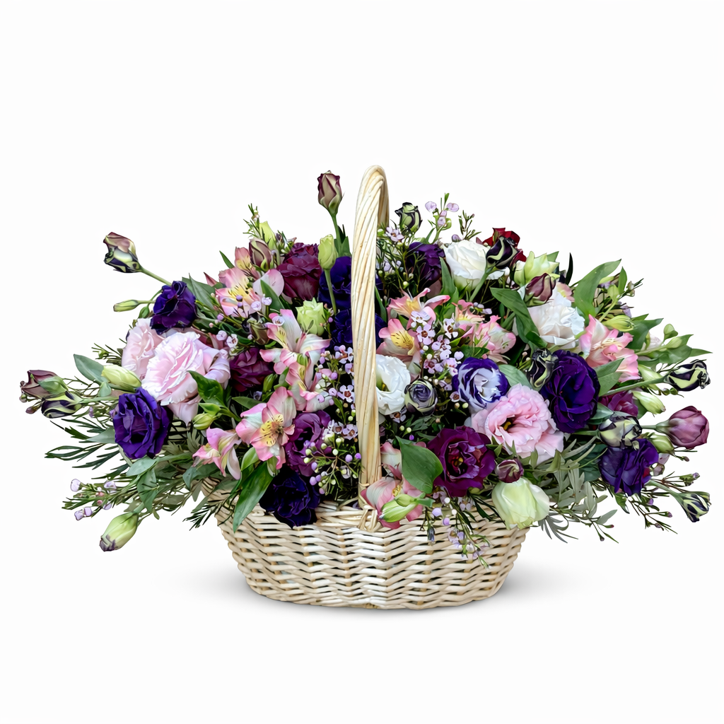 סידור פרחים עשיר ומלא חיים, המשלב ליזיאנטוס, אלסטרומריה ופרחי מילוי עדינים בגווני ורוד, סגול ולבן. הסל הקלוע עם הידית מעניק תחושת מתנה קלאסית ואלגנטית, עם נוכחות מרשימה ופריסה טבעית.
