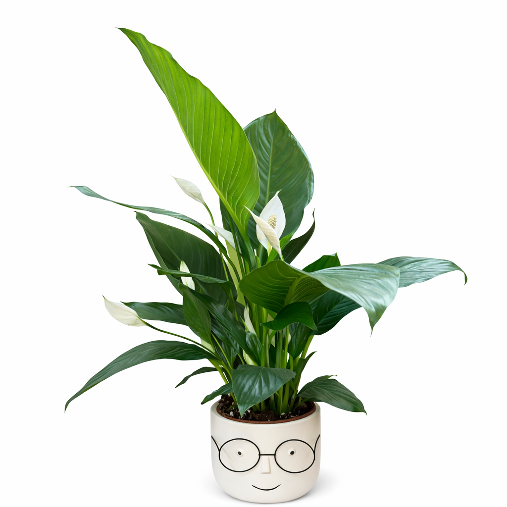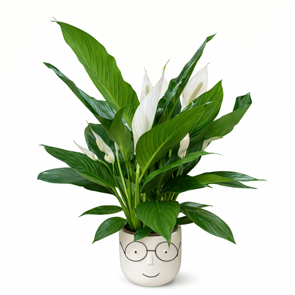ספטיפיליום אלגנטי עם עלים ירוקים מבריקים ופריחה לבנה נקייה, נטוע בכלי קרמיקה לבן עם עיצוב מינימליסטי. עציץ על-זמני שמביא רוגע ונוכחות שקטה לכל חלל.