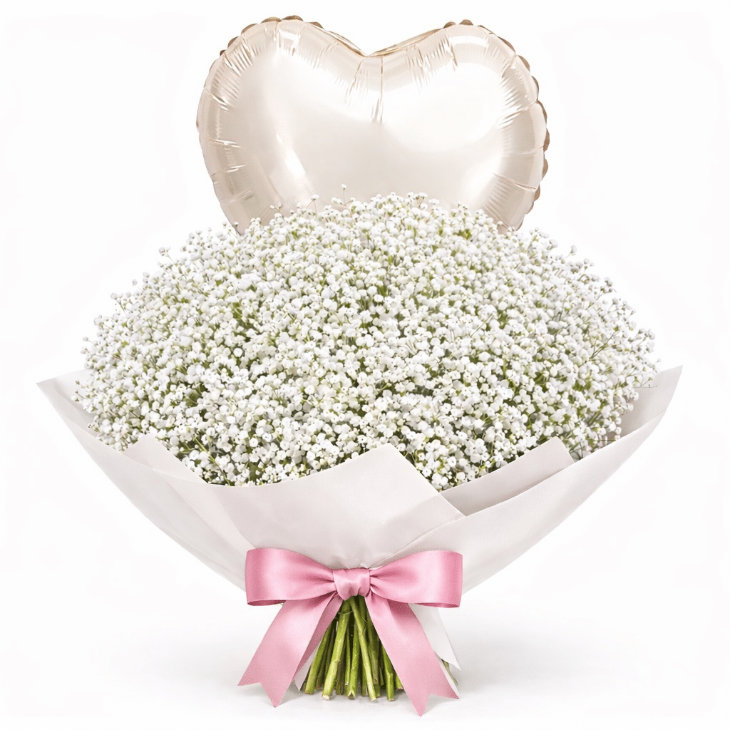 זר גיבסניות לבנות במראה ענני, עשיר ומלא נפח, היוצר תחושה של ניקיון, רכות ואלגנטיות על־זמנית + בלון הליום.