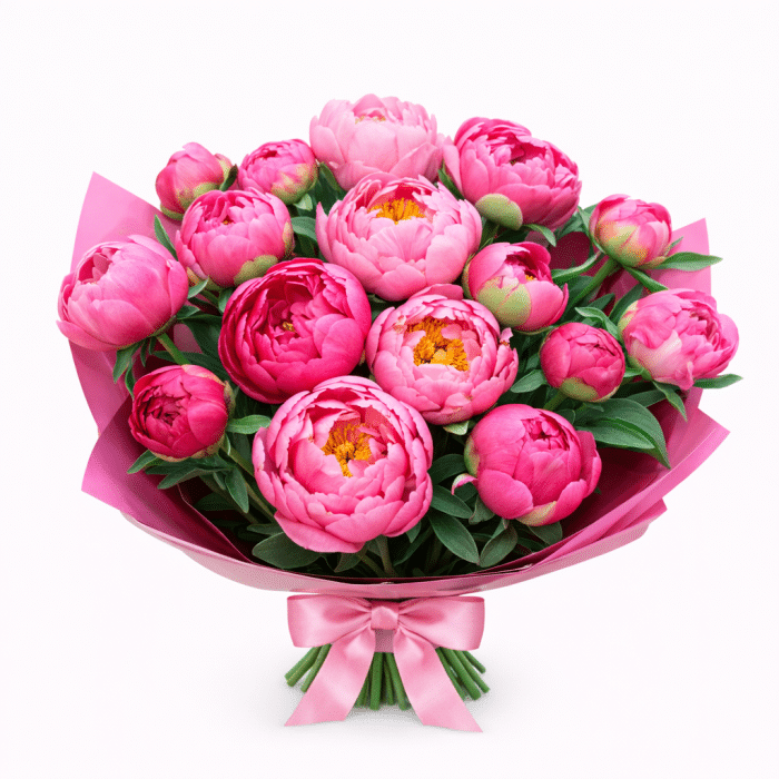 הפיונים מסודרים בצפיפות עדינה שמדגישה את נפח הפריחה ואת המרקם הקטיפתי, בעטיפה ורודה אלגנטית שמשלימה את הגוון הרומנטי של הזר.