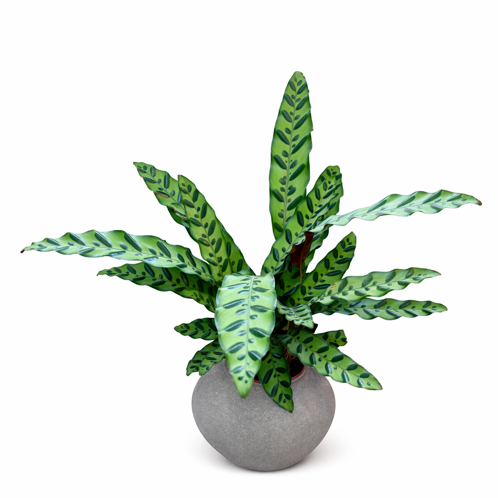 קלתיאה מרשימה עם עלים גרפיים ודוגמה טבעית ייחודית, נטועה בכלי קרמיקה אפור בגימור מאט.