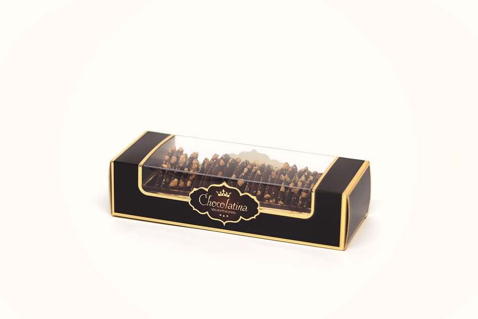 שוקולטינה – דסקיות שוקולד חום במארז מוזהב אלגנטי.