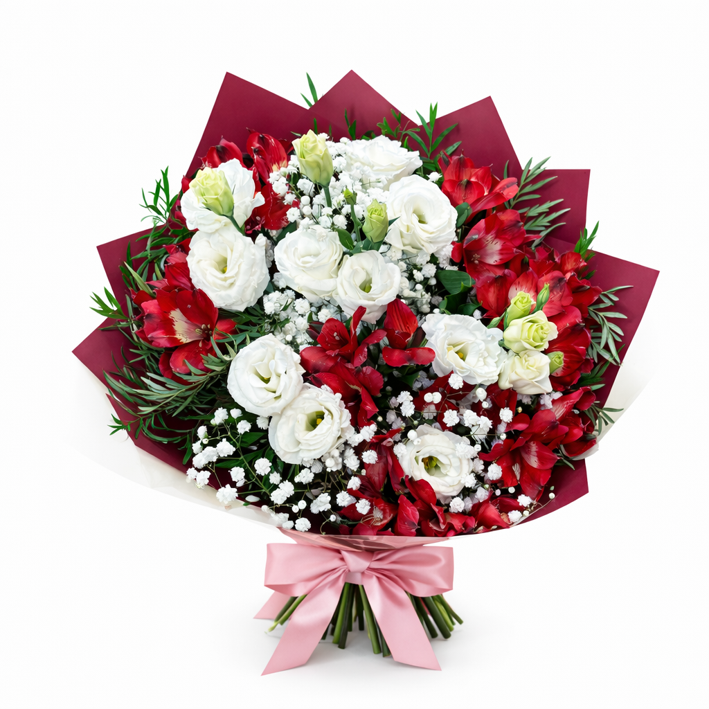 זר אלגנטי ומרשים בגווני אדום ולבן, המשלב פרחי ליזיאנטוס עדינים בצבע לבן, אלסטרומריה אדומה עשירה ופרחי גיפסנית לבנה להשלמת המראה.